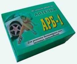 Для ремонта безкамерных шин лег.автомобилей, размер коробки, мм: 120х150х70, состав «АРБ-1»: Пластырь диаметр 35 – 2 шт. Пластырь диаметр 50– 1 шт. Пластырь диаметр 68– 1шт. Пластырь диаметр 88– 1шт. Пластырь диаметр 32х70– 1шт. Шнур – 10шт. Грибок резиновый – 1(7х38мм) – 1шт. Грибой резиновый – 2 (9х50мм) – 1шт. Грибок резиновый – 3 (11х60мм) – 1шт. Грибок резиновый – 4 (13х70мм) -1шт. Клей резиновый самовулканизующийся 50 г. Приспособление для вставки грибков – 1шт. Приспособление для вставки шнуров -1шт. Универсальное приспособление (ролик с теркой) – 1шт.